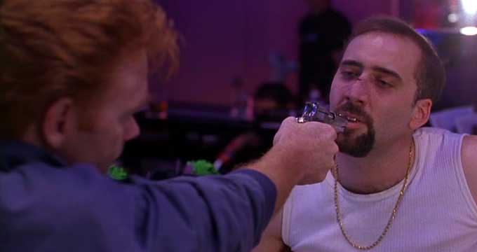 Cage isn’t in the film for a while; we waste a lot of time on stupid David Caruso. But when Cage returns, he comes back in a big way. We learn of his acronym mantra (you know, “letters that stand for things”); it’s “BAD: Balls. Attitude. Direction.” Not too long later, he straight-up murders a main character, sort of just because he can, and sort of because “you don’t know who you can trust.”